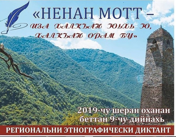 НОХЧИЙН РЕСПУБЛИКИН ДЕШАРАН А, 1ИЛМАНАН А МИНИСТЕРСТВОС ХААМ БО РЕГИОНАЛЬНИ ЭТНОГРАФИЧЕСКИ ДИКТАНТ Д1АЯХЬАРХ ЛАЬЦНА. ИЗА, НОХЧИЙН МАТТЕ БОЛУ БЕЗАМ Ч1АГ1БАН, ЦУЬНАН ВАЙН ДАХАРЕХЬ ЛЕЛАР СОВДАККХА, РЕСПУБЛИКИН БАХАРХОЙН НЕНАН МАТТАХ ДОЛУ ХААРШ АЛСАМДАХА ЙОЛЧУ 1АЛАШОНЦА ЕШ Ю. "НЕНАН МОТТ – ИЗА ХАЛКЪАН ЮЬХЬ Ю, ХАЛКЪАН ОРАМ БУ" Ц1Е ЙОЛУ ЭТНОГРАФИЧЕСКИ ДИКТАНТ 2019-ЧУ ШЕРАН ОХАНАН БЕТТАН 9-ЧУ ДИЙНАХЬ ХИР Ю. ДИКТАНТ ЯЗЪЕН МЕТТИГАШ НОХЧИЙН РЕСПУБЛИКИН МАССО А ДЕШАРАН ОРГАНИЗАЦИШ Ю. ДИКТАНТАН Т1ЕДАХКАРШ ТЕСТИЙН КЕПЕХЬ ДОЛЧУ 50 ХАТТАРХ ЛАЬТТА. ИЗА Д1АХЬОШ А, ЦУЬНАН ЖАМ1АШ ДЕШ А ВОВШАХТОХАРАН КОМИТЕТО БОЛХ БИЙР БУ. ЭТНОГРАФИЧЕСКИ ДИКТАНТАХ ЛАЬЦНА ЮЬЗЗИНА ЙОЛУ ИНФОРМАЦИ МИНИСТЕРСТВОН САЙТ Т1ЕХЬ Ю.